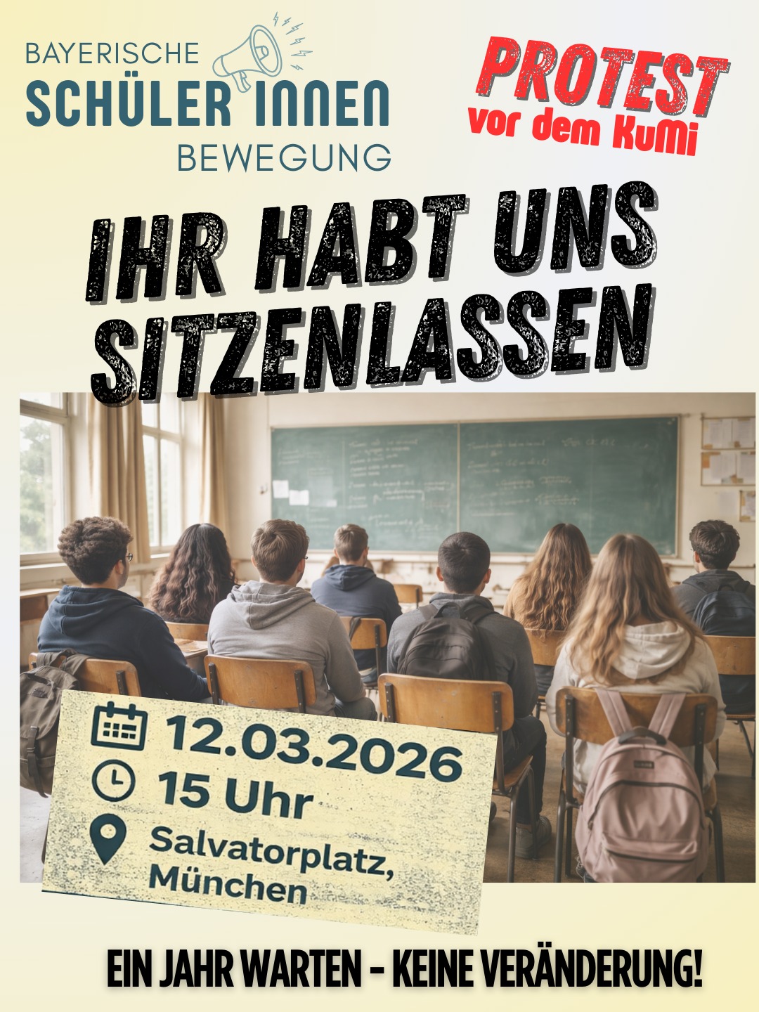 Am 12.3.2026 setzen wir ein Zeichen vor dem Kultusministerium in München: Sei dabei, setz dich zu uns und zeige, dass leere Versprechen nicht reichen!